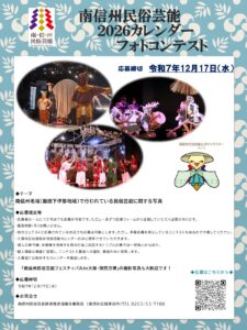 ◆応募規定等 ・撮影時期(年)は問いません。 ・応募者お一人につき何点でも応募が可能です。ただし一点ずつ応募フォームから送信して いただく必要があります。 ・他のコンテストに応募されている作品でも応募は可能とします。ただし、重複応募を禁止 しているコンテストもあるので注意してください。 ・入賞作品は南信州民俗芸能カレンダーのみに使用させていただきます。 ・個人の著作権、肖像権を侵害する等の行為に起因するトラブルの責任は一切負いかねます。 ・個人情報は厳重に管理し、コンテスト入賞者への通知、発送のみに使用します。 ・入賞者には制作するカレンダーを贈呈します。 ◆応募締切 令和7年12月17日(水)